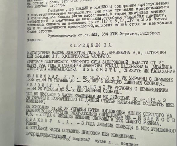 Деталі: Вирок суду першої інстанції (Пологівського райсуду Запорізької області) від 21 березня 1996 року складається з 26 сторінок тексту, написаного від руки.