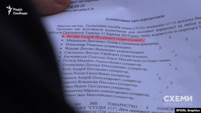 Дослівно: "6 лютого 2019-го року, у розпал передвиборчої кампанії з обрання президента України, "Телевізійна служба новин "1+1" попросила акредитувати Богдана Андрія Йосиповича до Центральної виборчої комісії. Саме його прізвище було вказане першим у переліку з 15-х журналістів "ТСН" на акредитацію".
