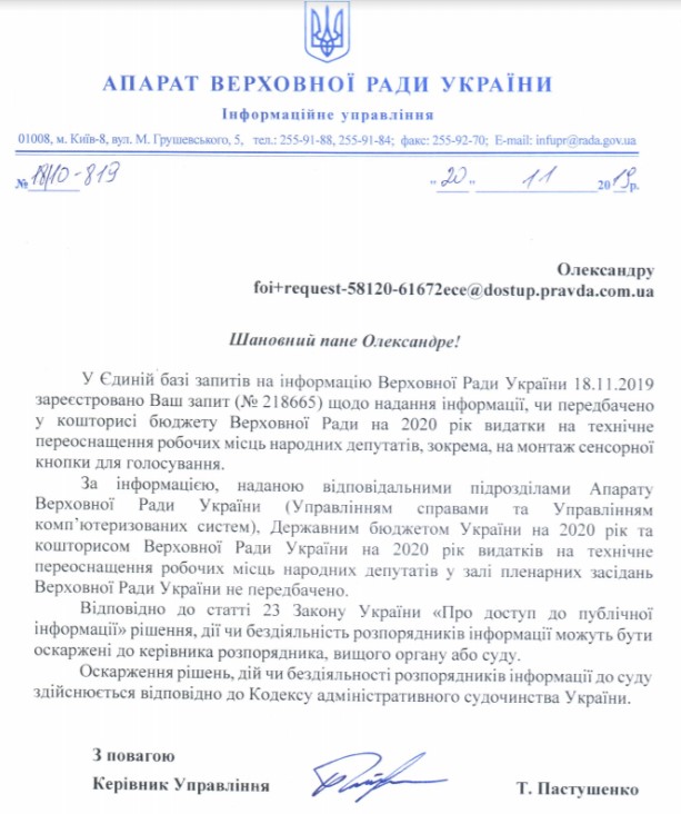 Дослівно: "Державним бюджетом на 2020 рік та кошторисом Верховної Ради на 2020 рік видатків на технічне переоснащення робочих місць народних депутатів у залі пленарних засідань не передбачено".