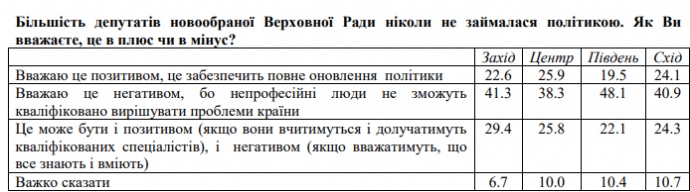 Причому одразу після виборів думки виборців були істотно іншими: негативом відсутність політичного досвіду у новобраних депутатів вважали лише 25%, 35% оцінювали це, навпаки, як позитив, а 26%, як і зараз, бачили можливості як позитиву, так і негативну.
