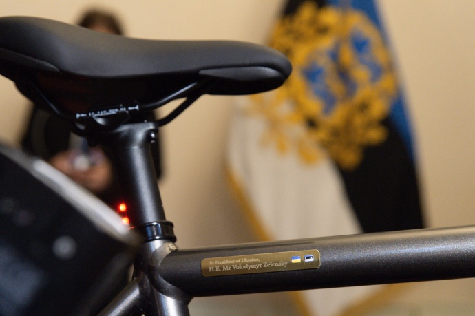 "Президенту України, його високоповажності містеру Володимиру Зеленському", - написано на рамі велосипеда, поруч розміщені прапори України та Естонії.