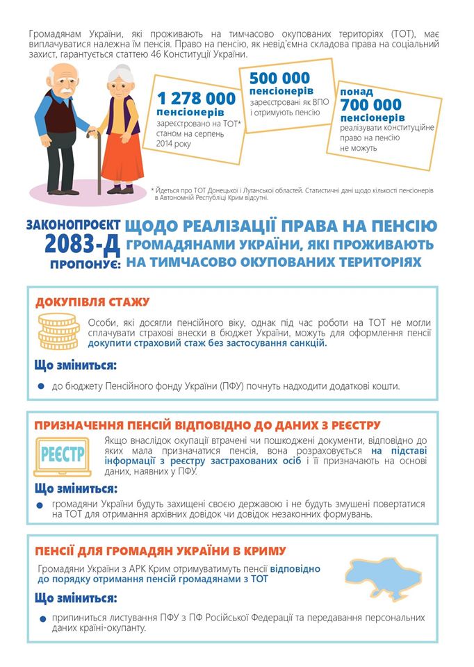 - Надати людям, які жили на тимчасово окупованих територіях і не могли платити страхові внески, право докупити стаж без застосування санкцій;