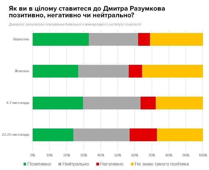 До Дмитра Разумкова позитивно ставляться в кінці листопада 24% опитаних, негативно – 16%. Частка тих, хто ставиться до Разумкова негативно, значуще зросла з 9% до 16%".