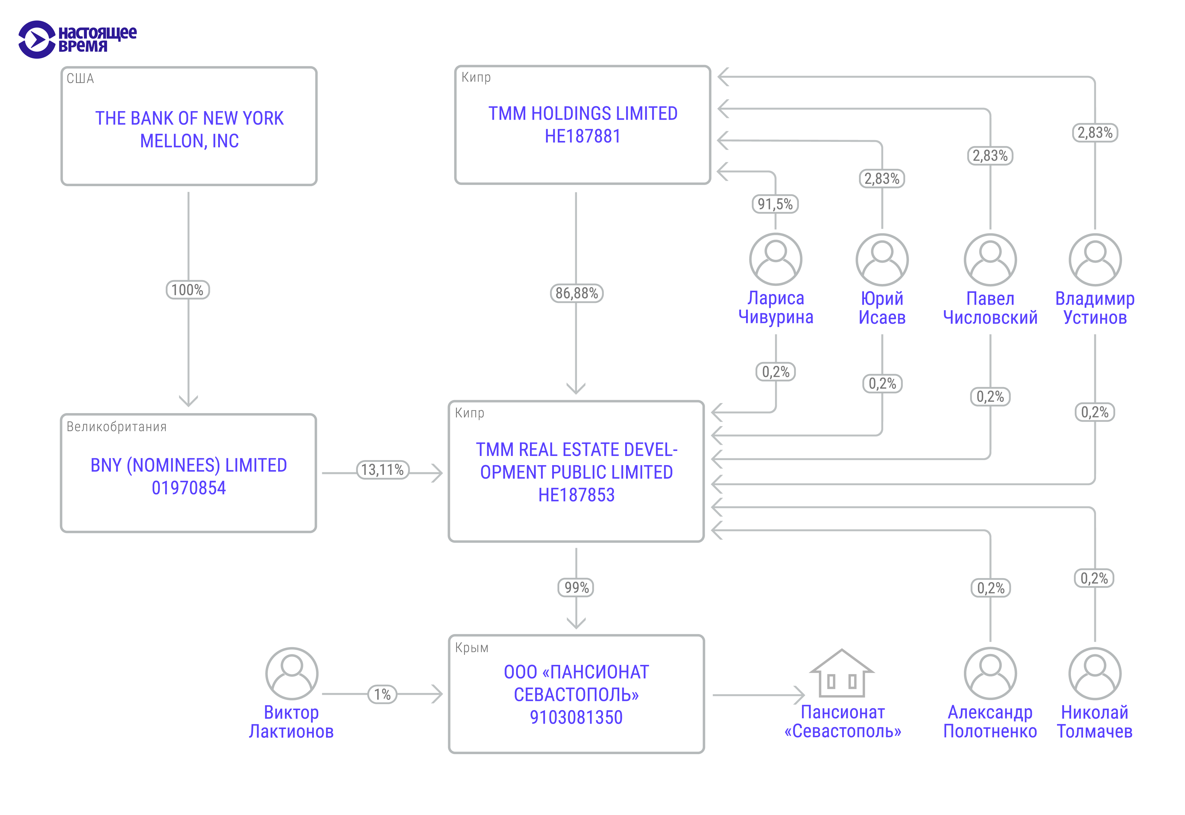 ТОВ "Пансіонат "Севастополь" був зареєстрований у російському реєстрі в серпні 2016 року і на 1% належить директору Віктору Лактіонову, а його інші 99% належать кіпрській TMM Real Estate Development Public Limited.