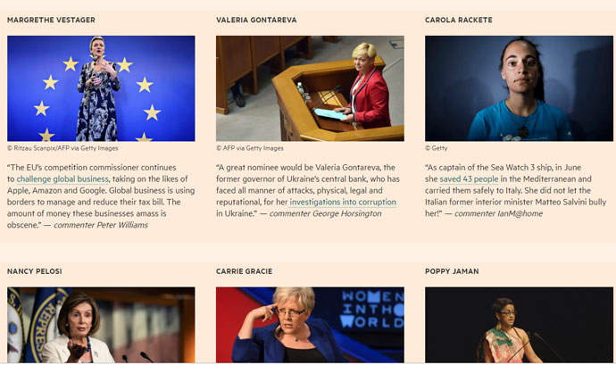 Серед надихаючих жінок назвали еко-активістку Грету Тунберг, борця за збереження Великобританії в Європейському союзі і противника Brexit Джин Міллер, прем'єр-міністра Нової Зеландії Ясінду Арден, філіппінського правозахисника Лейлу де Ліму, американського сенатора Елізабет Уоррен, данського політика, комісара Євросоюзу з питань конкуренції Маргрет Вестагер, капітана судна Каролу Ракеті, яка вела рятувальний корабель з біженцями і яку звинувачують у сприянні нелегальній міграції, та інших.