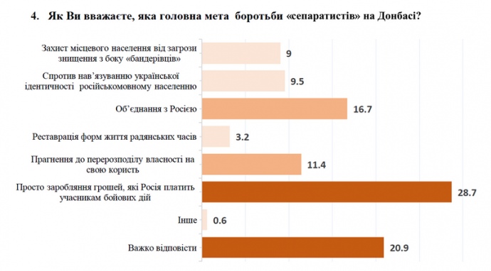 Дослівно: "Найбільша частка українців вважають, що метою боротьби "сепаратистів" на Донбасі є просто заробляння грошей, які Росія платить учасникам бойових дій (29%)".