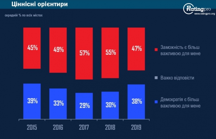 Водночас прослідковується тенденція: у західних містах люди частіше обирали демократію, у східних – заможність. Так, найбільше опитаних (58%) обрали демократію у Тернополі, а найбільше обрали заможність у Маріуполі (63%).