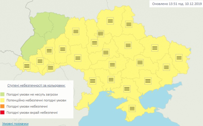Деталі: Як свідчить попередження на сайті Укргідрометцентру, така сама ситуація очікується на більшій частині території України – І рівень небезпечності, жовтий.