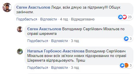 Деталі: Євген Акастьолов у коментарях до свого посту написав, що обшук – "по справі Шеремета" (журналіст Павло Шеремет загинув 20 липня 2016 року від вибуху в автомобілі).