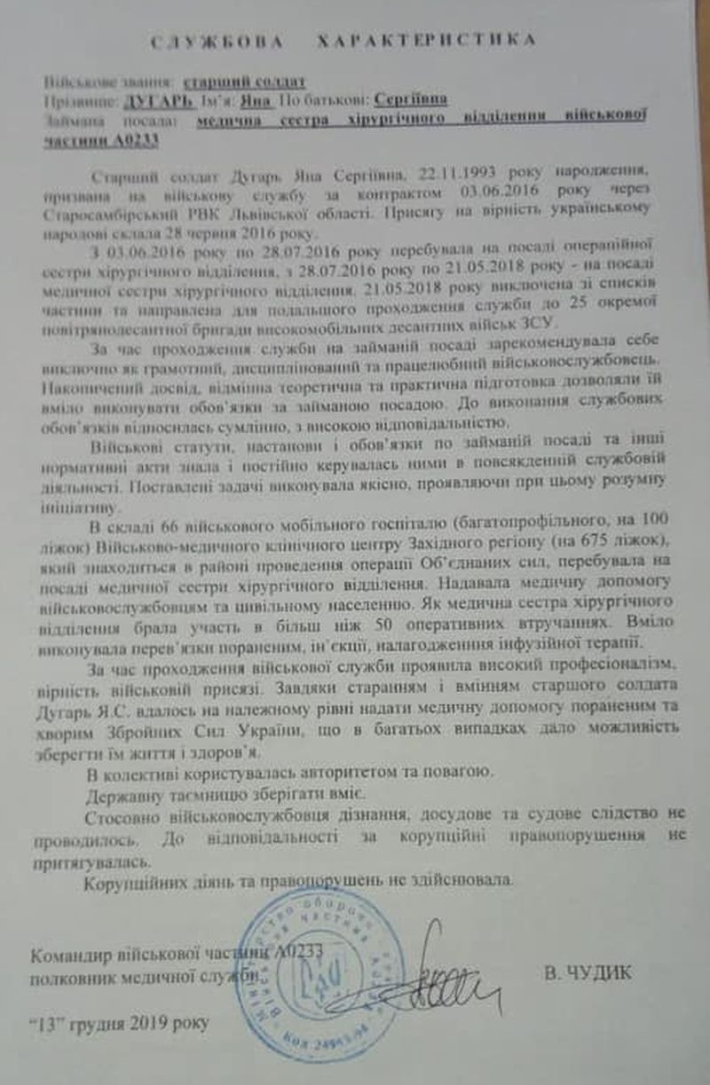 Пряма мова Зінкевич: "Службова характеристика Яни Дугарь з 66 госпіталю, в якому вона служила на момент вбивства Шеремета. Характеристика, звісно ж, позитивна. І особливо звертаю увагу на те, що з 03.06 до 28.07 вона перебувала на посаді операційної сестри (вбивство було 20 липня)".