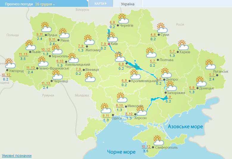 16 грудня опадів не очікується, на заході температура вдень підвищиться до +13, у центральних областях +6...9, на сході до +8, на півдні до +11. Вночі на заході температура знизиться до 0...+4, у центральних регіонах до +2, на сході до +3 градусів, на півдні +1...+3.