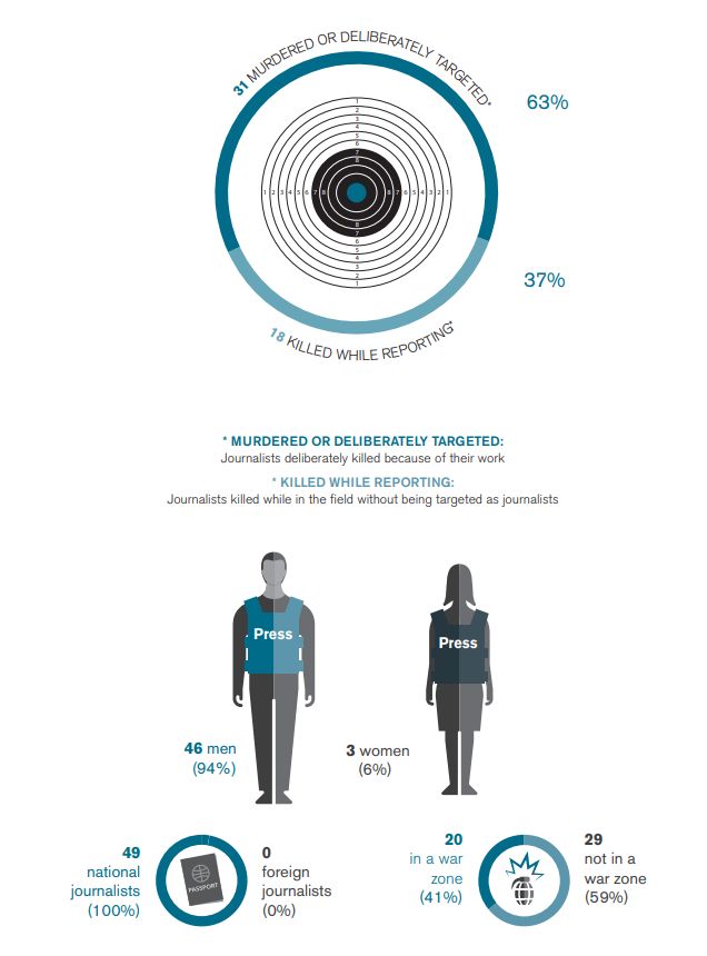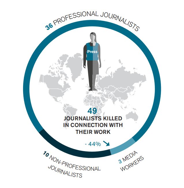 Кількість загиблих журналістів цього року – 49 – є найнижчою з 2003 року, й це вражаюче зниження на 44% порівняно з минулим роком. Цьогоріч "історично низький" показник, порівняно з середньорічним 80 загиблих журналістів протягом останніх двох десятиліть, є насамперед результатом зменшення кількості загиблих журналістів у зонах війни.