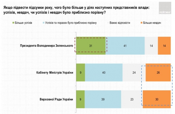 Близько чверті респондентів вважають, що у діях Кабінету міністрів та Верховної Ради було більше невдач. Близько 40% сказали, що успіхів та невдач було порівну і лише близько 10% вважають, що було більше успіхів.