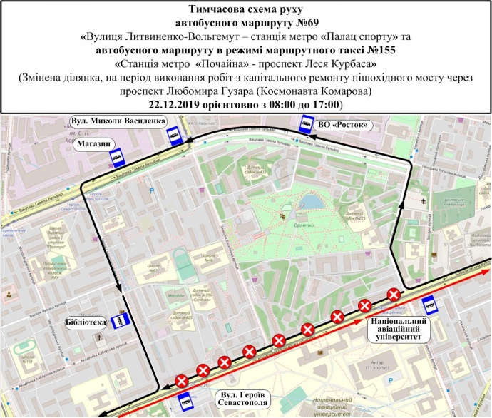 22 грудня на просп. Любомира Гузара рух буде перекрито з 9:00 до 17:00 через капітальний ремонт пішохідного мосту, маршрути автобусів №№ 69, 155 буде змінено.