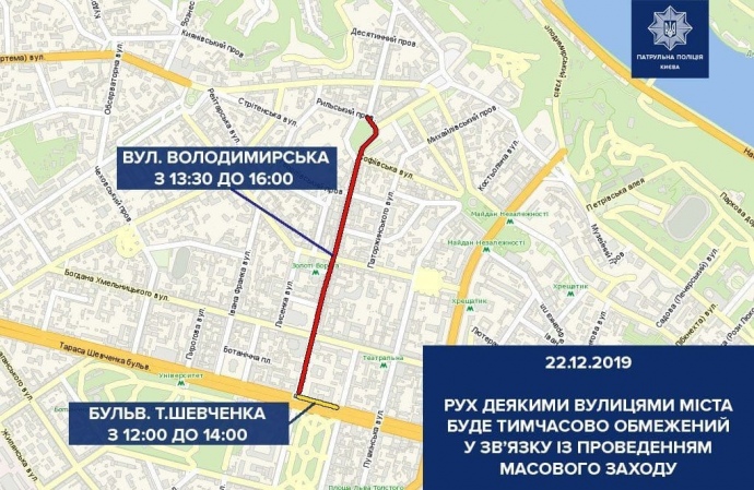 22 грудня із 00:00 до 15:00 – на вул. Володимирській зі сторони парку Тараса Шевченка навпроти червоного корпусу Національного університету України ім. Тараса Шевченка і на вул. Володимирській біля будинків № 19 та № 21/20.