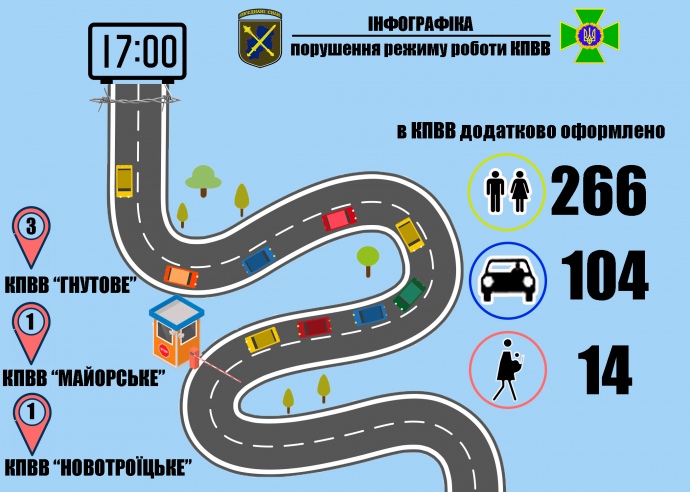 Було 5 випадків, коли після 17:00 з тимчасово окупованої території України прибувала значна кількість громадян та автомобілів. Тоді за рішенням командувача Об’єднаних сил роботу зазначених КПВВ продовжували.