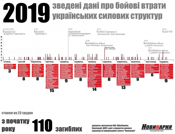 Дослівно: "Подивіться на цей колаж з облич. Вражає? Вражає. Їх 110 – полеглих у 2019 році внаслідок бойових дій (станом на 23 грудня; йдеться про підтверджені бойові втрати всіх силових підрозділів у зоні АТО/ООС і смерті від бойових поранень)".
