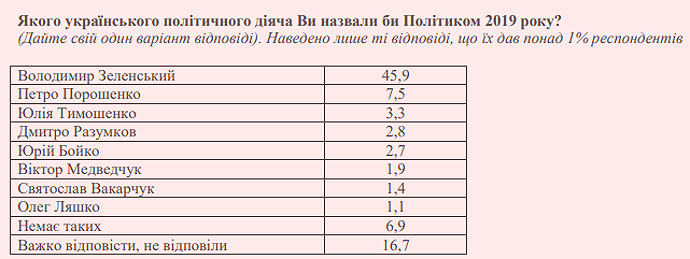 Дослівно: "Політиком 2019 року однозначно визнано Володимира Зеленського – його назвали у відкритому питанні 46% населення".