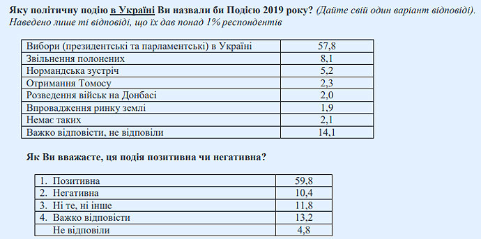 Також серед головних подій року – звільнення полонених (8%), нормандська зустріч (5%), отримання Томосу (2%), розведення військ на Донбасі (2%), впровадження ринку землі (2%).