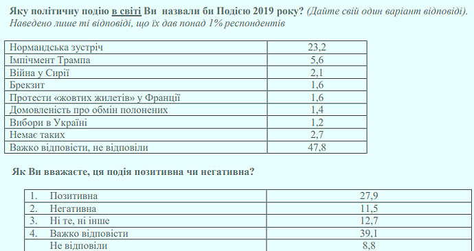 Головною політичною подією у світі назвали нормандську зустріч (23%), імпічмент Трампа (6%), війна в Сирії (2%), Брекзит (2%), протести "жовтих жилетів" у Франції (2%).