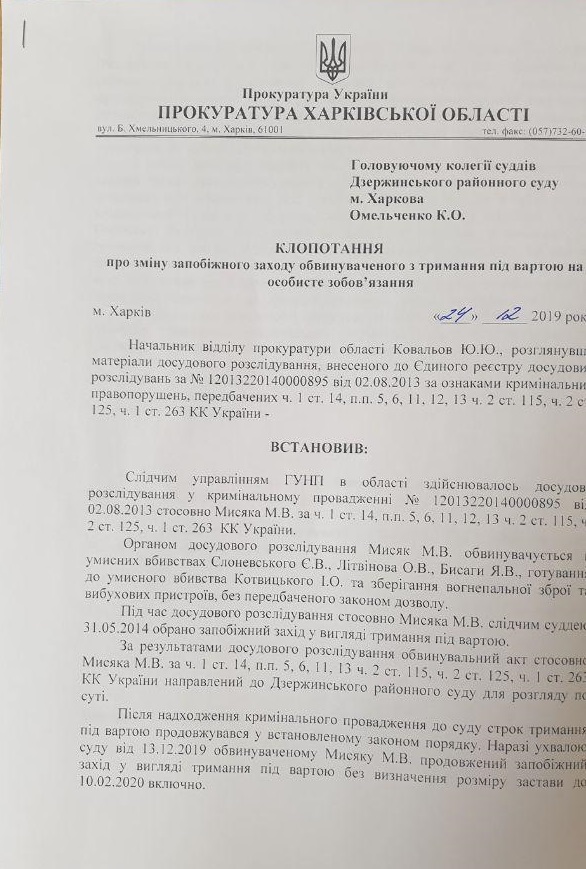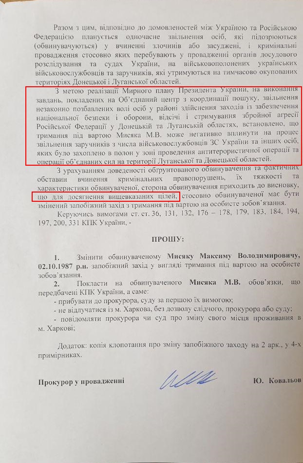 Відповідно до клопотання, оприлюдненого юристом, прокурор просив змінити Мисяку запобіжний захід на особисте зобов’язання "з метою реалізації мирного плану президента України, на виконання покладених на Об’єднаний центр з координації пошуку, звільнення незаконно позбавлених волі осіб у районі здійснення заходів із забезпечення національної безпеки і оборони".
