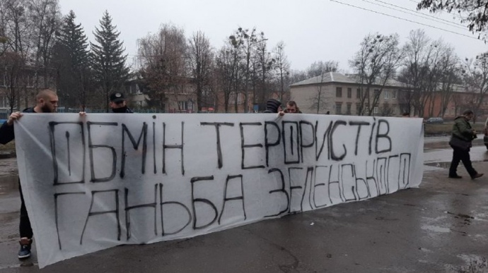 Біля будівлі суду кілька людей розгорнули транспарант: "Обмін терористів — ганьба Зеленського".