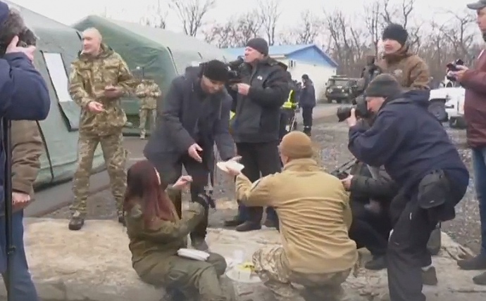Деталі: Як видно з трансляції Офісу президента, утримувані особи, які будуть передані Україні, вийшли з автобусів ОРДЛО та зайшли до великого намету, де відбувалася їх ідентифікація.