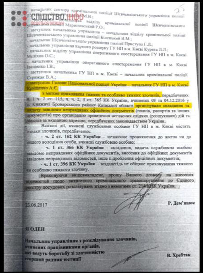 Дослівно рапорт прокурора Дем’янюка: "З метою приховання тяжких та особливо тяжких злочинів (…) організували складання та видачу завідомо неправдивих офіційних документів (планів, рапортів, та інших документів) про організацію проведення слідчих дій та заходів".