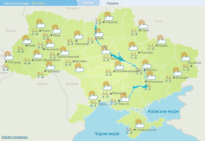 У понеділок, 6 січня, очікується мінлива хмарність, без опадів, температура вночі знизиться до -5...-6 у західних областях, до -9 у Чернівецькій області, на решті території від 0 до -4. Вдень на заході, сході та півдні прогнозують до +2 градусів, у центральних областях та північному сході - -1...+1.