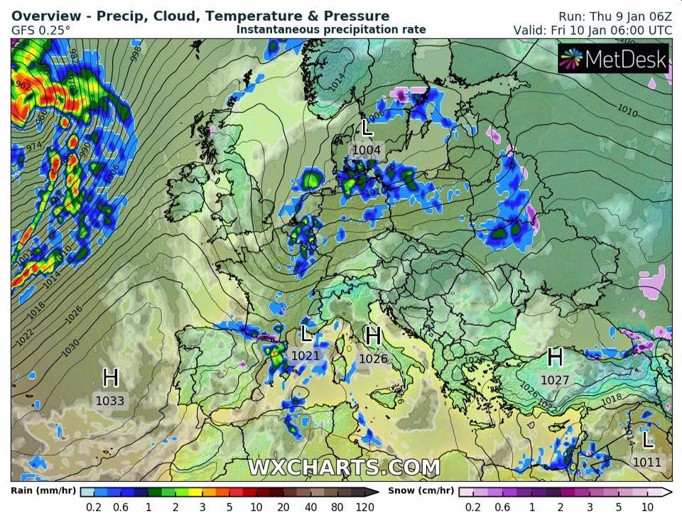 Синоптик Діденко: "Циклон з центром недалеко від Данії зашле завтра, 10 січня, в Україну свій атмосферний фронт. Його дари – традиційні, дощ та мокрий сніг. Опади в п‘ятницю найбільш ймовірні на Півночі України, в західних областях, трохи зачеплять Центр і, можливо, Харківщину. Значна частина Сходу та Півдня побуде без істотних опадів.