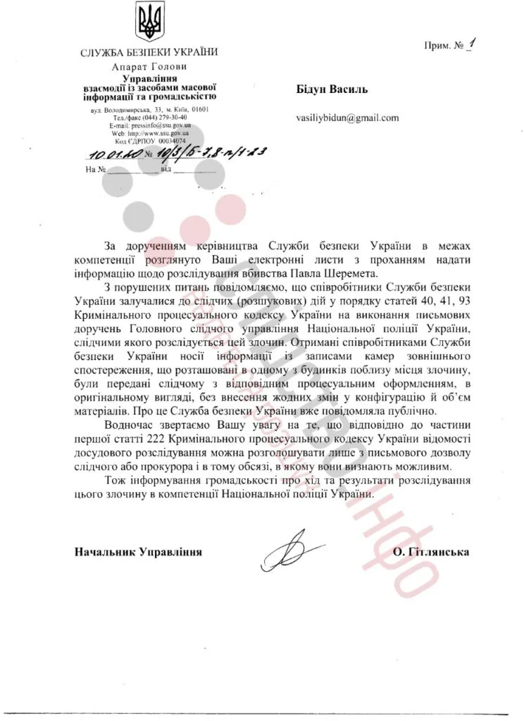 Дослівно: "Отримані співробітниками Служби безпеки України носії інформації із записами камер зовнішнього спостереження, що розташовані в одному з будинків поблизу місця злочину, були передані слідчому з відповідним процесуальним оформленням, в оригінальному вигляді, без внесення жодних змін у конфігурацію й об’єм матеріалів".