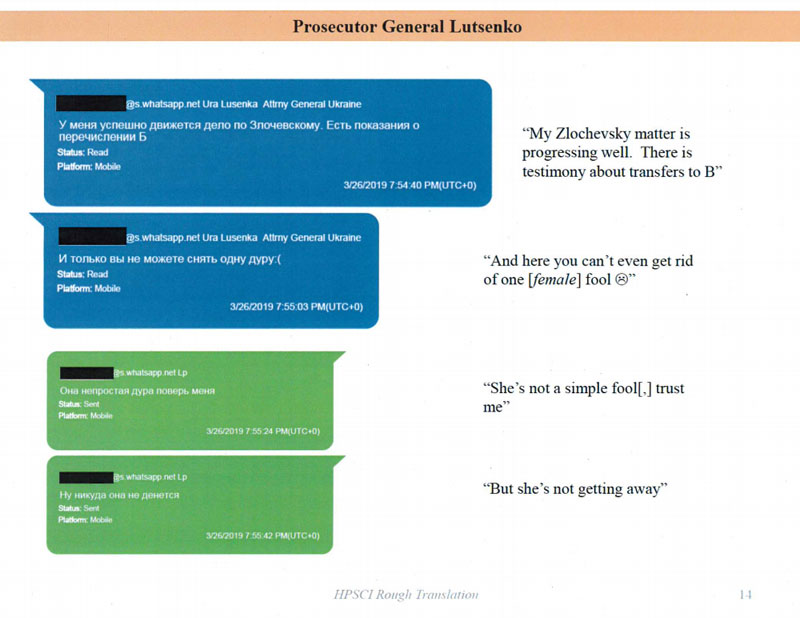 Генпрокурор також писав, що "якщо ви не будете вживати заходів щодо мадам, то поставите під сумнів усі мої заяви, у тому числі по Б" (ймовірно, мова про сина Байдена).