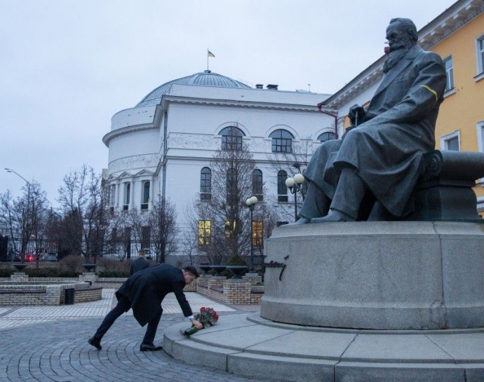 Президент Володимир Зеленський взяв участь у церемонії покладання квітів до пам’ятників Тарасу Шевченку та Михайлу Грушевському з нагоди відзначення Дня соборності України.
