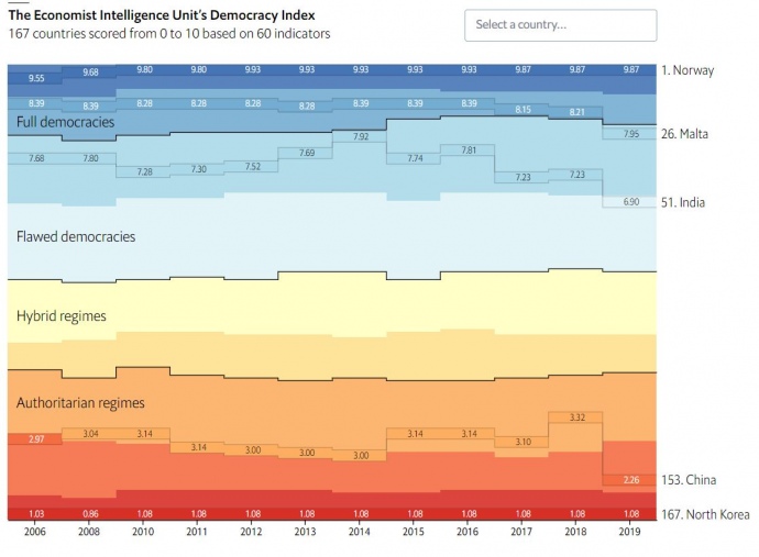 У щорічному опитуванні оцінюється стан демократії в 167 країнах на основі п'яти показників - виборчий процес і плюралізм, функціонування уряду, участь у політичному житті, демократична політична культура та громадянські свободи.