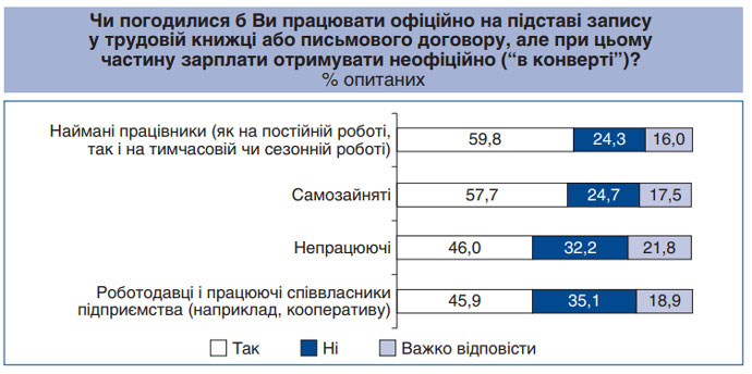 Деталі: Працювати офіційно, але частину зарплати одержувати "в конверті" погодилися б половина опитаних: як серед роботодавців, так і серед найманих працівників, самозайнятих і непрацюючих.