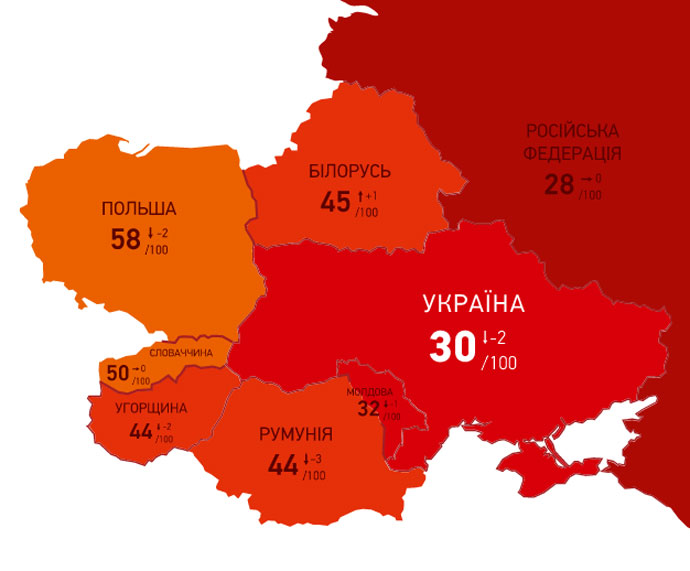 Деталі: Водночас відзначається, що Україна з-поміж сусідів випереджає Росію, яка зберегла свої позиції (28 балів, 137 місце).