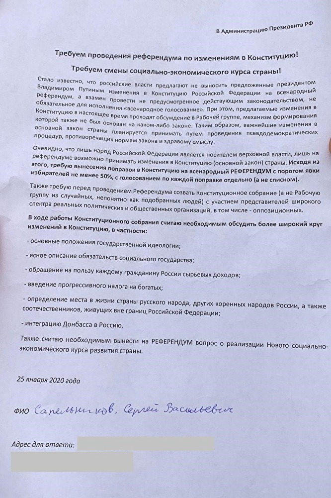 Серед пропозицій, озвучених у зверненні - включення до Конституції положень про "прогресивний податок для багатих" та "інтеграція Донбасу до Росії".