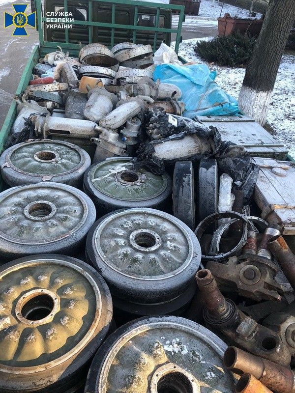 Під час слідчих дій було виявлено та вилучено значну кількість військових приладів нічного бачення, радіостанції, трансмісії, балансири, катки, деталі гусеничних стрічок, електродвигуни допоміжних систем та інші деталі до бронетехніки.