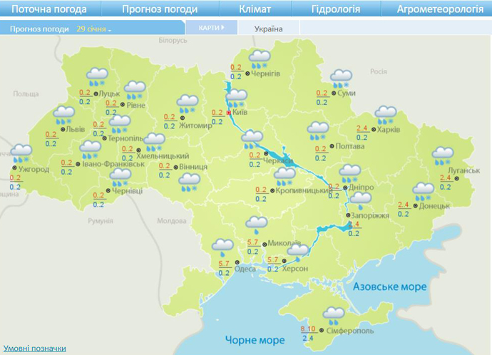У середу, 29 січня, атмосферні фронти зумовлять в Україні ускладнення погоди. По всій території країни пройдуть дощі, подекуди з мокрим снігом.