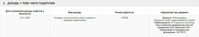 2 січня Лещенко також вніс майже 124 тисячі гривень доходу "за зайняття підприємницькою діяльністю" від ТОВ Бізнесгрупп.