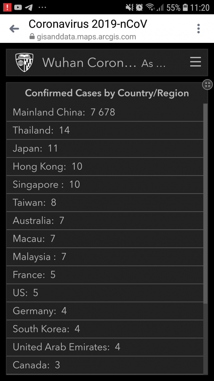 Коронавірус, що поширюється з китайського Уханя (провінція Хубей), у всьому світі вразив уже 7 783 людини. Кількість хворих за добу з 28 до 29 січня зросла на 1726, ще 38 людей загинуло. Загалом від початку поширення нового вірусу зафіксовано 170 смертей. Усі вони сталися в Китаї.