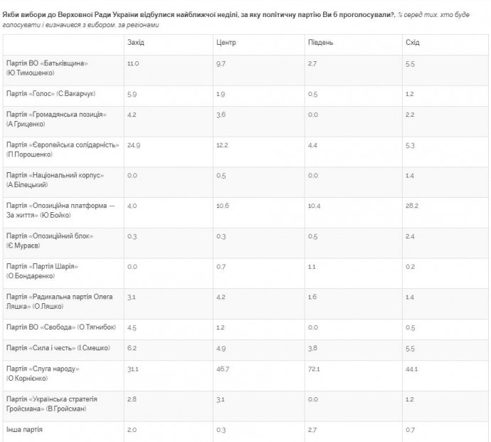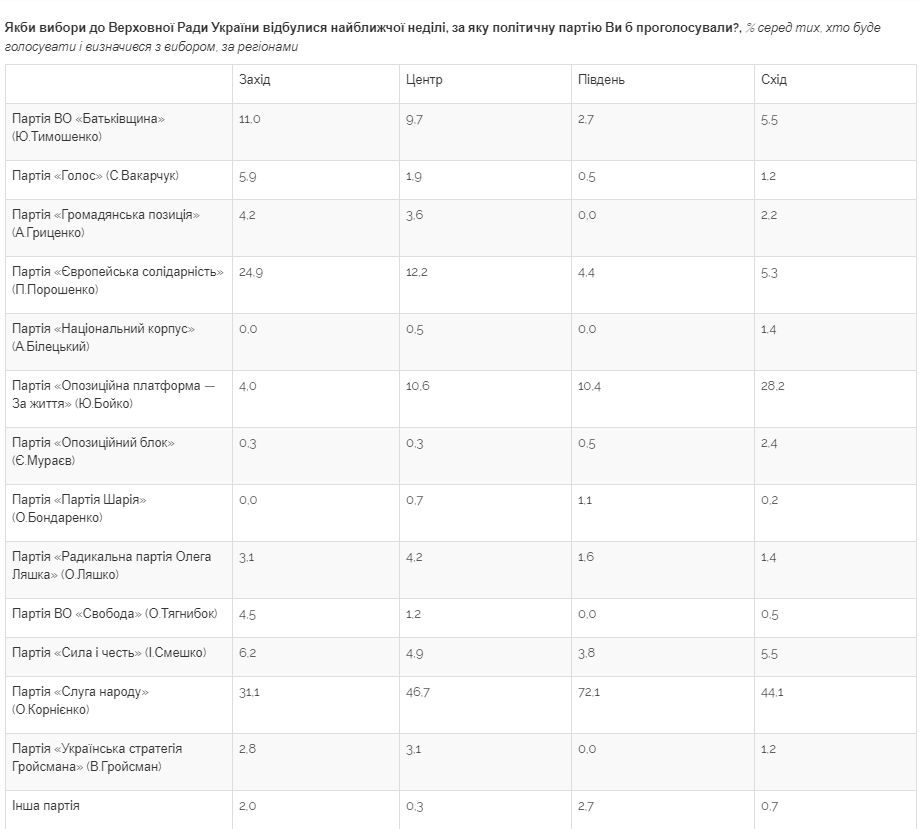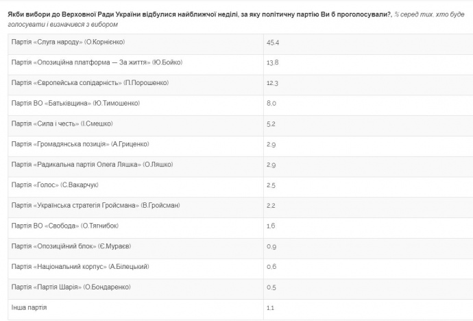 Соціологи дослівно: "Якби вибори до Верховної Ради відбулися найближчої неділі, ті виборці, які мають намір піти на вибори і вже визначилися з вибором, найчастіше віддали б свій голос за партію "Слуга народу" – 45,4% тих, хто піде на вибори і визначився з вибором.
