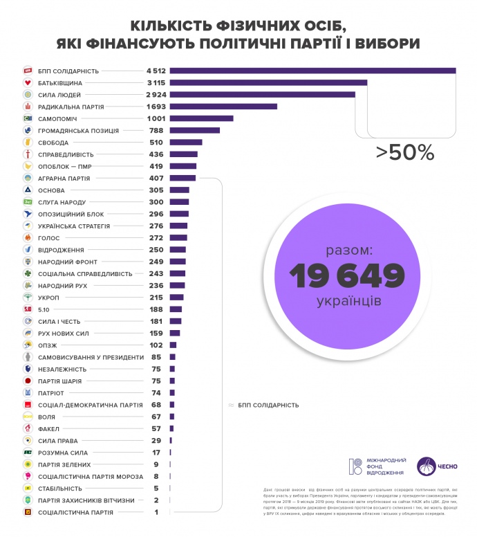 Найбільше фізичних осіб-донорів – у "Європейської солідарності". Їх понад 4,5 тисяч. На другому місці – ВО "Батьківщина", далі – "Сила людей".