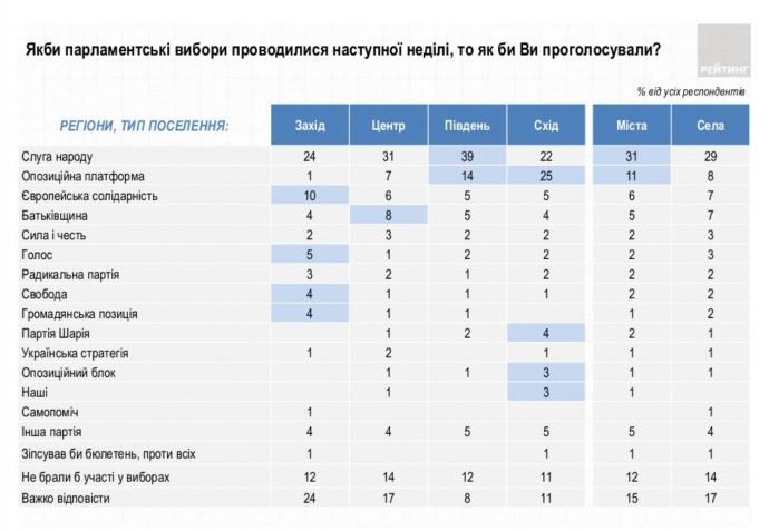 Деталі: Згідно з опитуванням, рейтинг політичних сил очолює партія "Слуга народу" із 42,2% підтримки серед тих, хто визначився та має намір голосувати. На другому місці партія "Опозиційна платформа – За життя" – 13,5%. "Європейська солідарність" Петра Порошенка третя – 9,5%. "Батьківщина" четверта – 8,1%.
