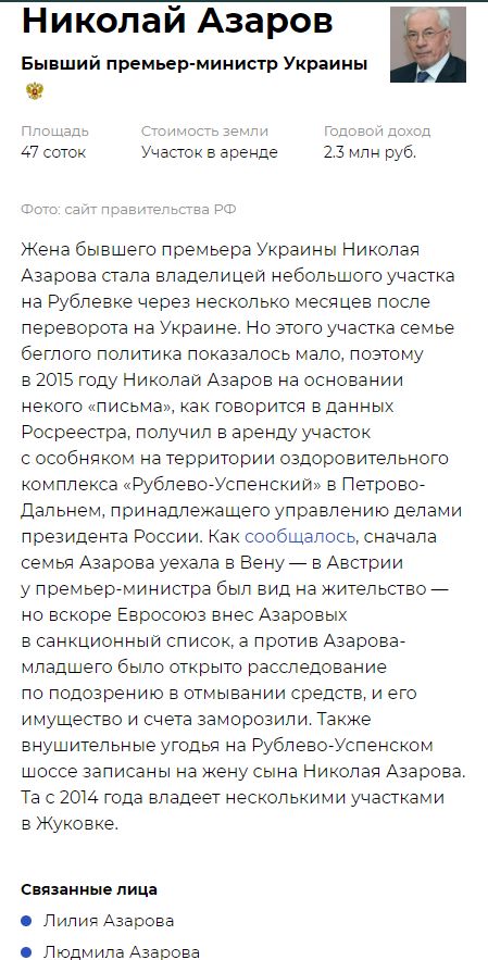 Деталі: Микола Азаров узяв в безстрокову оренду у Російської Федерації майже 50 соток землі в селі Петрово-Дальнє. До кінця 2014 року цією ділянкою розпоряджався "Оздоровчий комплекс Рубльово-Успенський" Управління справами президента РФ.