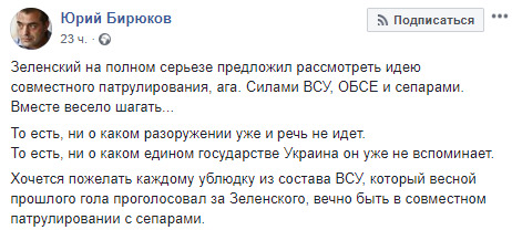 Що було раніше: 16 лютого радник колишнього президента Юрій Бірюков написав у Facebook пост, у якому побажав "каждому ублюдку из состава ВСУ, который весной прошлого года проголосовал за Зеленского, вечно быть в совместном патрулировании с сепарами".