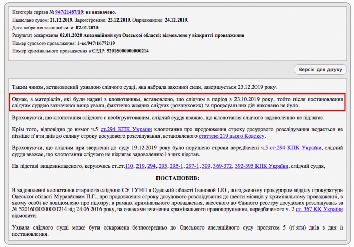 Деталі: 19 грудня 2019 року суд відмовився продовжити строки слідства. Згідно з матеріалами справи, вони мали сплисти 23 грудня.