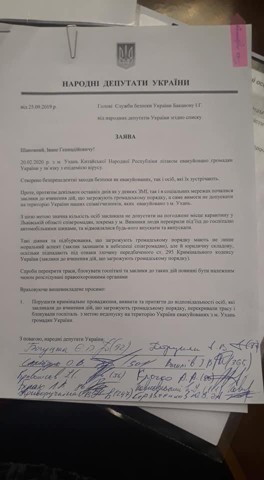 Дослівно: "Просимо порушити кримінальне провадження, виявити та притягти до відповідальності осіб, які закликали до вчинення дій, що загрожують громадському порядку, перекривали трасу та блокували госпіталь з метою недопуску на територію України евакуйованих з міста Ухань громадян України".