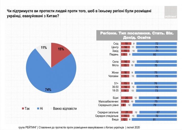 74% українців не підтримують протести проти розміщення евакуйованих з Китаю, які відбулися напередодні.