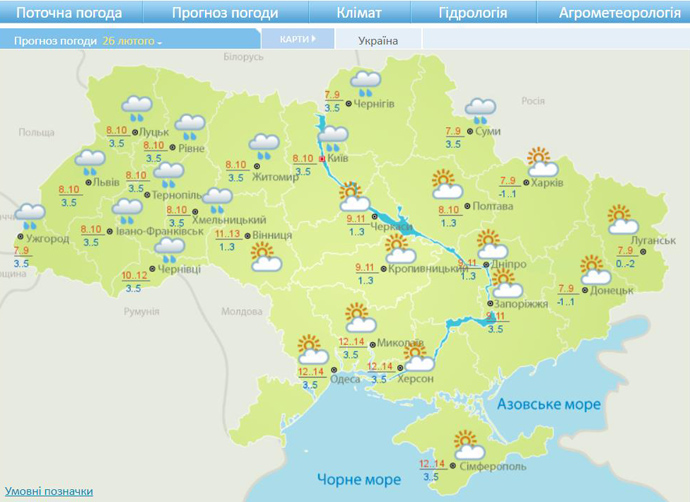 У середу, 26 лютого, на території України переважатиме суха погода без опадів, а температура повітря прогріється місцями до 14 градусів тепла.